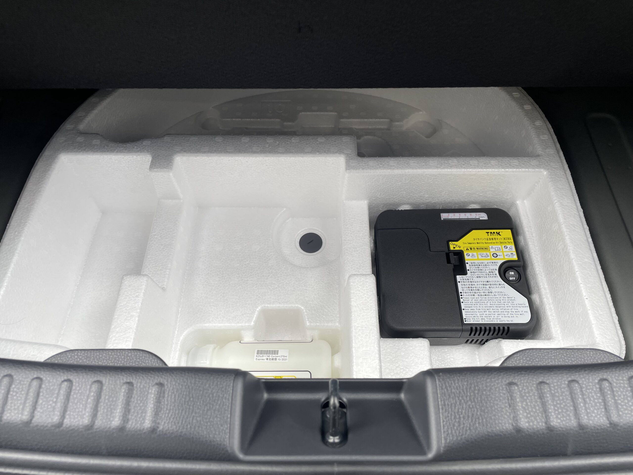 トランク下部にパンク修理キットが収納されています。